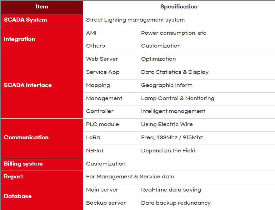 IoT management system (hereinafter referred to as SCADA) can automatically make light switches on/off, remote control, and real-time event alarm on the system. SCADA system consists of task management, remote control of the customized functions, power consumption management, the local communication channel, and other equipment. So our SCADA system can help save energy and human resources also, significantly it can reduce street light maintenance costs.